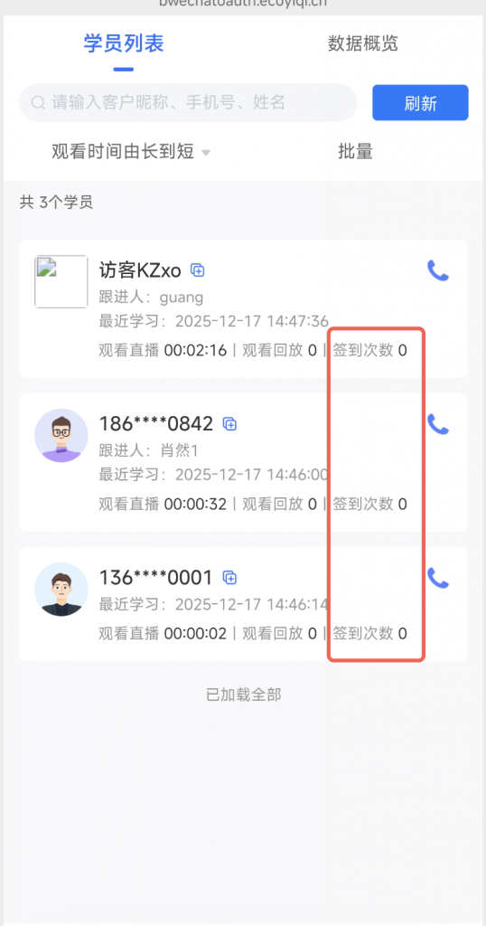 2、移动工作台支持显示直播签到次数