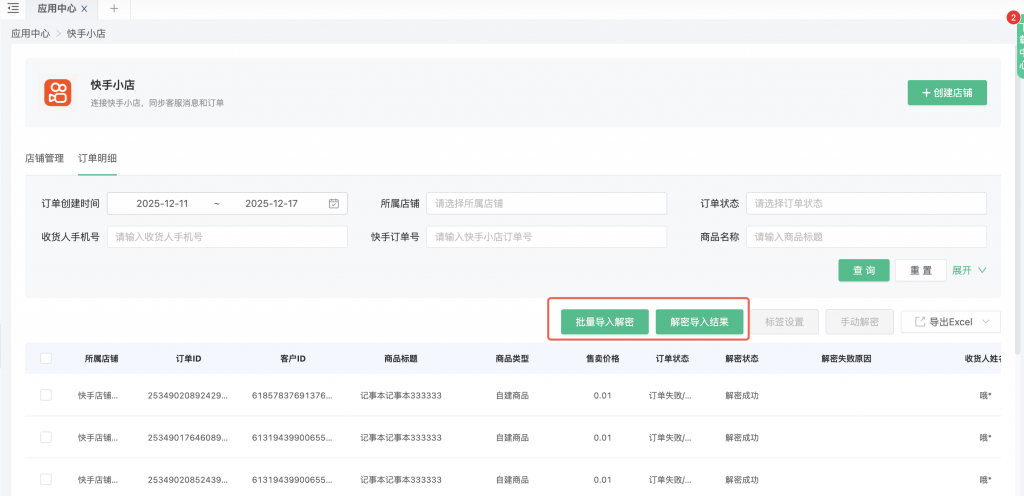 4、三方店铺:抖店、微信小店、小红书、快手小店 支持导入解密手机号