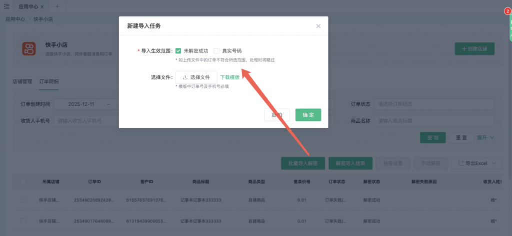 b.点击批量导出解密后,可选择生效范围,针对未解密与解密成功的数据均可进行解密,已解密成功的订单如果再次导出解密会覆盖系统中原本的手机号码