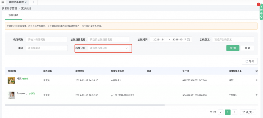 5、多人获客助手统计-所属分组筛选优化。只对上线后的新数据生效,历史数据无法按分组筛选。