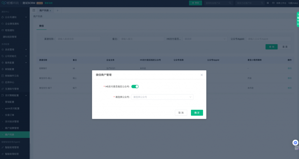 可在系统后台-【支付策略配置】,找到商户,点击修改开启【H5支付是否指定公众号】,选择易宝商户关联的公众号即可。