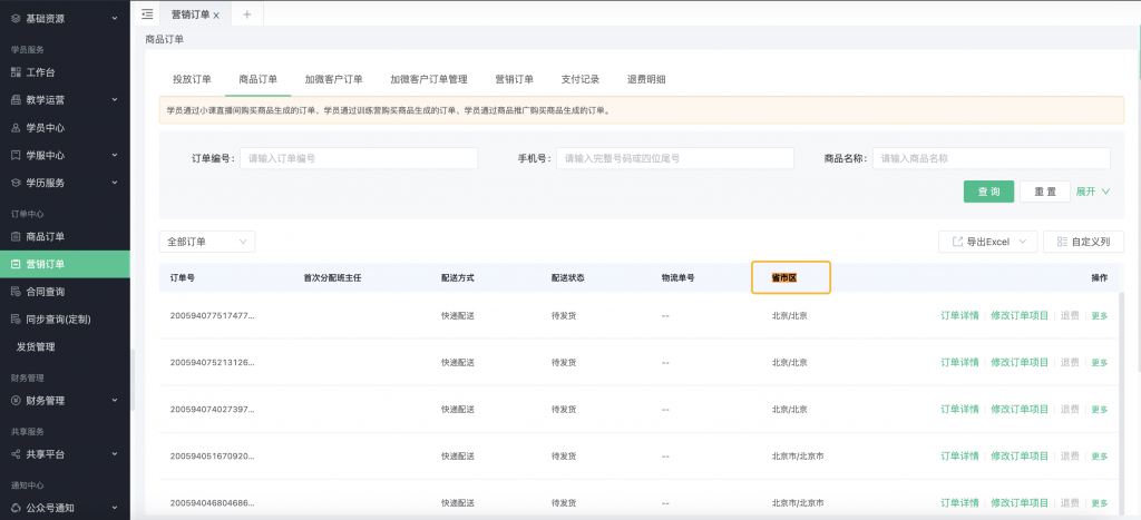 2、营销订单–商品订单中增加【省市区】字段信息展示